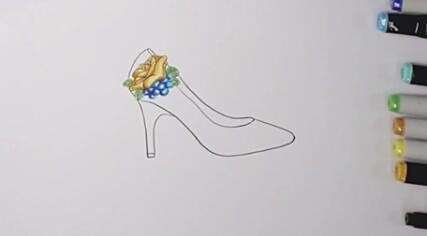 将高跟鞋的配饰用黄色和深蓝色进行涂抹