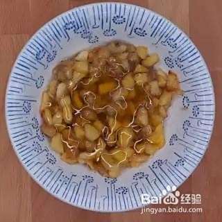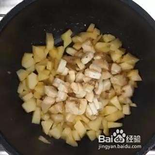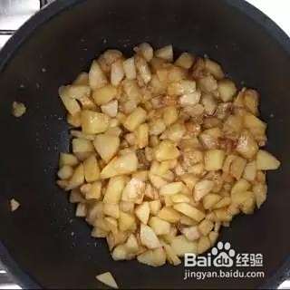 黄油加入锅中至融化,倒入苹果丁炒至微微变软即可加入香蕉。