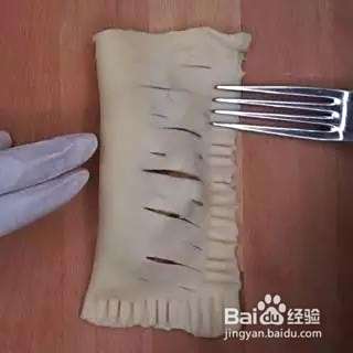 将馅料包入酥皮中,并用叉子封住边缘。