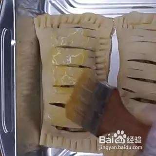 做好的苹果香蕉派放在烤盘中,用全蛋液刷在表层。