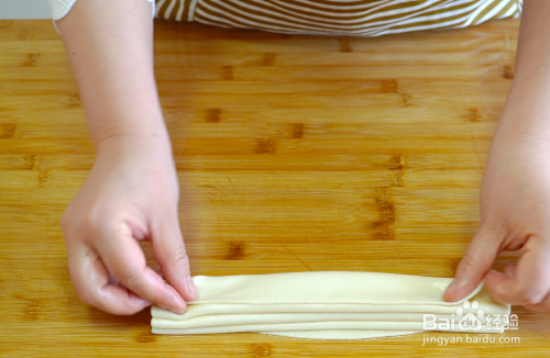 5.面团醒发好之后,然后再将其擀成长方形。在上面刷上一层油酥,像折扇子一样将其折叠起来。再从一边将其卷起,再次擀成薄饼状就可以啦。电饼铛预热在上面刷上一层食用油,油热之后将面饼放在上面,再刷上一层食用油。上下落至五分钟就可以了。