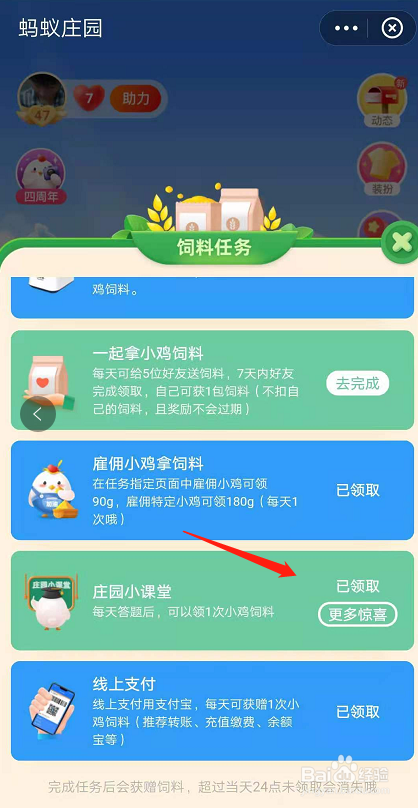 进入蚂蚁庄园小游戏,点击领饲料,如图