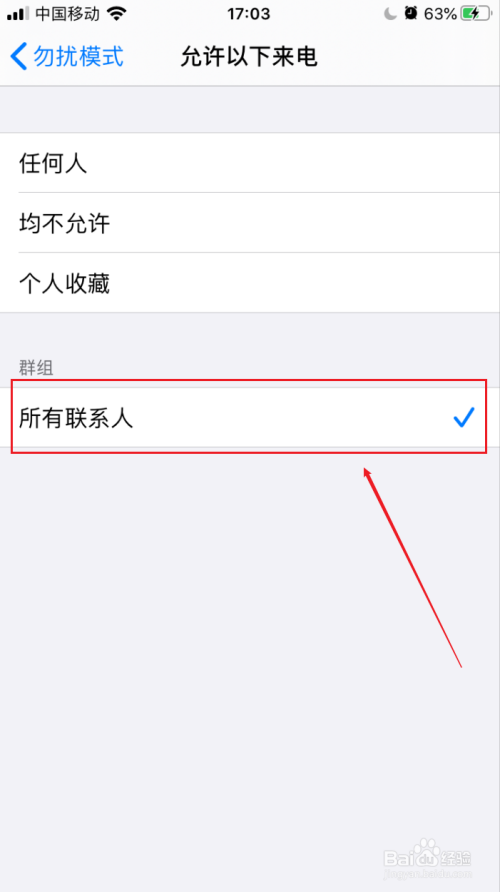 在允许以下来电设置界面点击勾选“所有联系人”即可