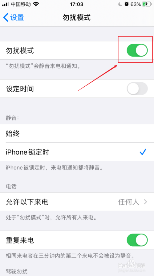 在勿扰模式界面将“勿扰模式”的开关按钮打开