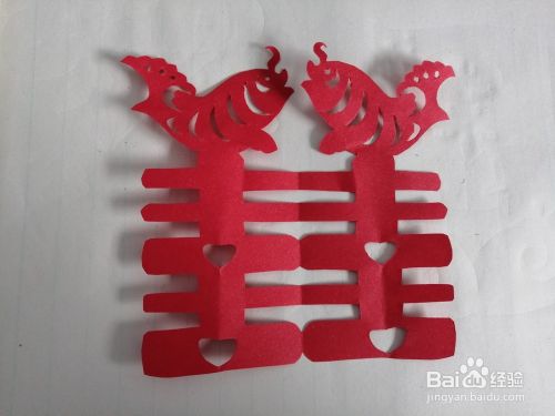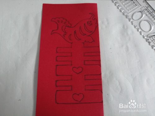 然后,我们在彩纸上画上喜字的一半,上边画上一条鱼。