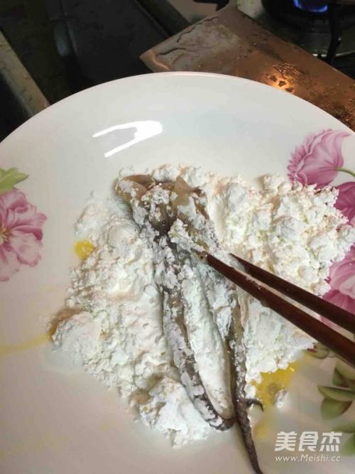 4把裹上蛋液的鱿鱼须再粘上干淀粉