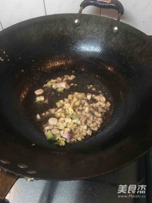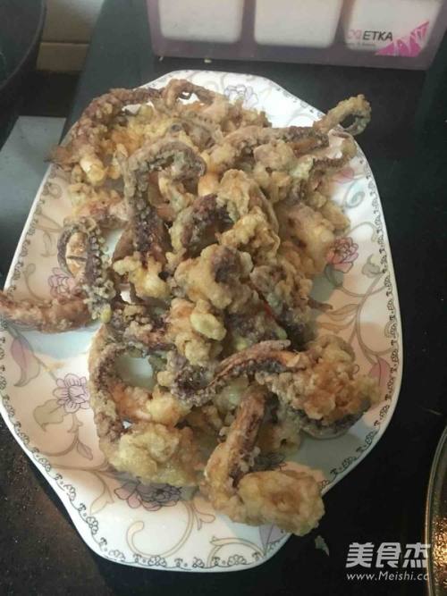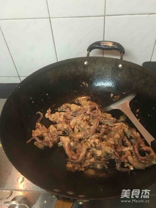 8再下入鱿鱼须翻炒片刻,洒入椒盐,再洒入葱花。起锅!一碟香喷喷的椒盐鱿鱼须就完成了!