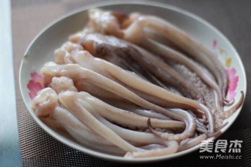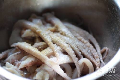 2把鱿鱼须切条状加入食盐、白糖、料酒、湖椒粉、鸡精腌制10分钟