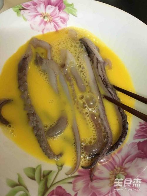 3鸡蛋打散放入鱿鱼须,使鱿鱼须充分裹上蛋液