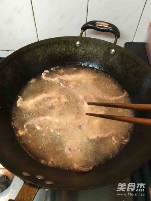 5锅内下油,大火烧至下筷子试油温时筷子边冒泡就可以下油锅了