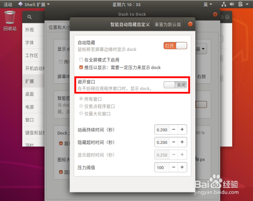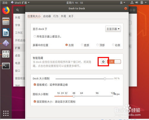 在窗口左边选择 扩展,在右边打开dash to dock,然后点击旁边的 配置 图标。