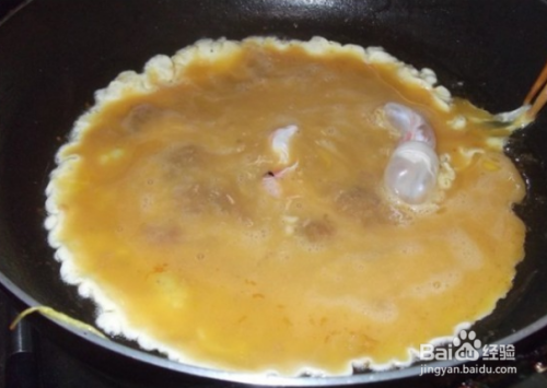 烧热油锅,倒入鱼籽蛋液,摊开。
