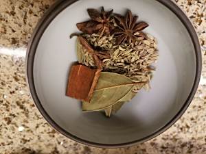 下八角2个,香叶3-4片,小茴香2-3g,肉桂1小块。