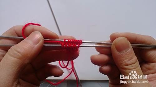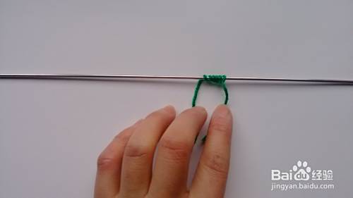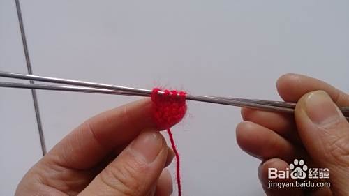 在一根12号针上起6针,绕圈织(即每次都将长线顺时针拽到有短线头一方,再开始织起,如此反复就成一圆柱状)