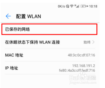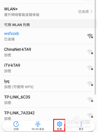 打开 WLAN 开关以后,会出现所有wifi的链接,再在界面底部找到“配置”的图标,点击。