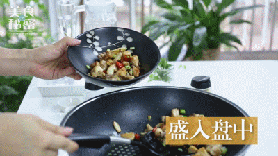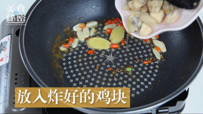 油变成金黄后,放入炸好的鸡块,翻炒均匀。