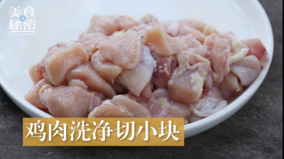 鸡肉洗净切小块,加入盐、料酒拌匀,腌制10分钟。