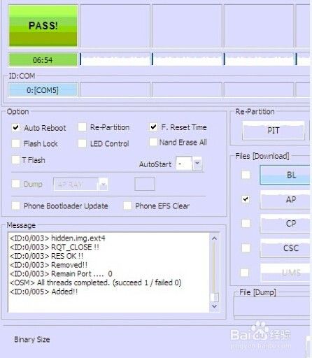 刷机完成后刷机平台的左上侧会显示绿色“PASS”PAS为成功 FAIL为失败(失败照包里教程重来一次)成功如下图:。