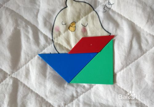 放上左右挨着的蓝色三角形、绿色三角形,如图。