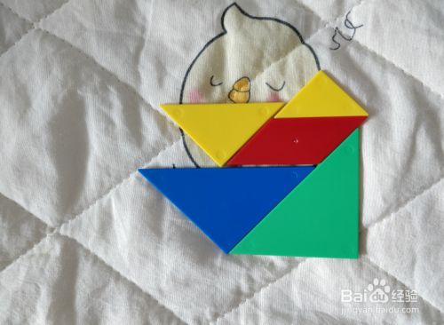 在黄色三角形的上面,放上黄色小三角形挨着,如图。