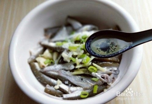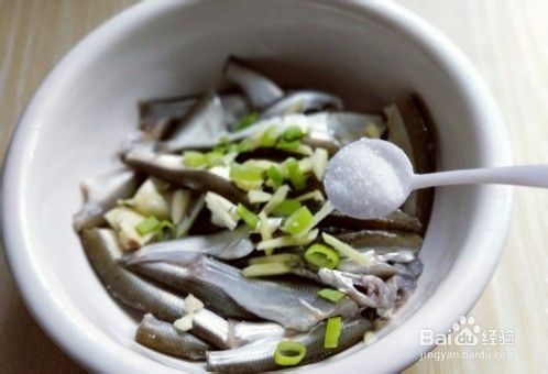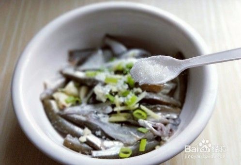 洗干净的小鱼放入器具中,加入切好的葱姜蒜,再加入盐。
