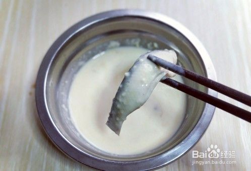 将腌制好的小鱼放入面糊里泡15秒,捞出淋掉多余的面糊。