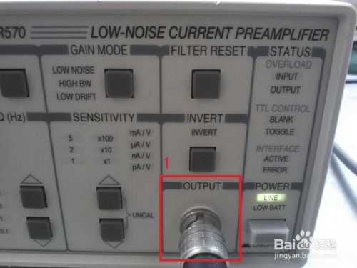 将BNC线的一端连接SR570的output端口(红框1),表示输出放大后的电压信号。