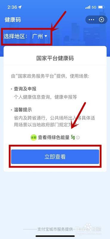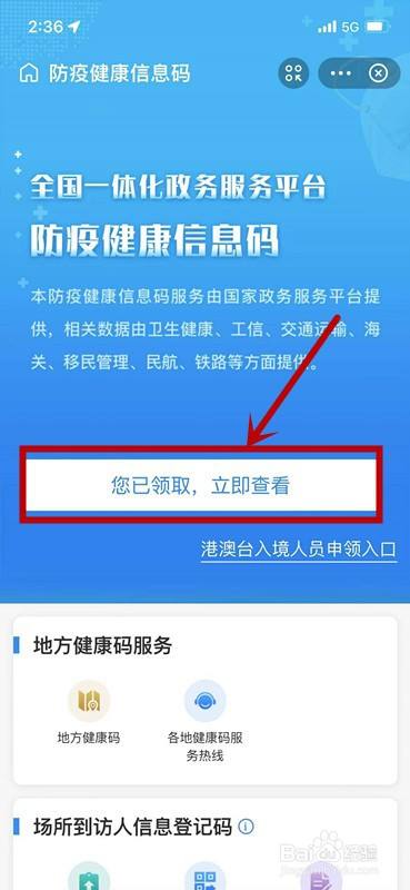 进入防疫健康码页面,确定区域,查看健康码即可。