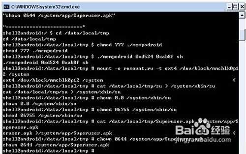 代码复制执行后,正确的输入如图,全部执行命令输完后,手机中出现了授权管理软件,也就是superuser,表示你的手机已经ROOT成功了。
