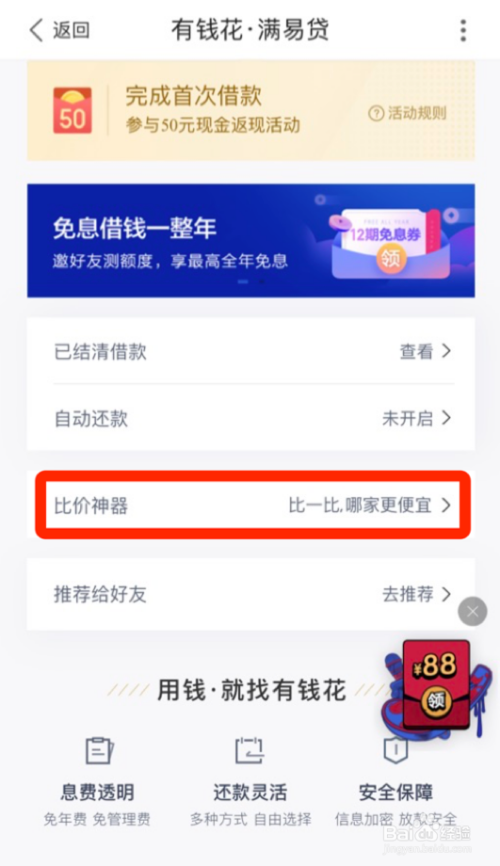 获得额度成功后打开满易贷,进入产品页面,就可以看到比价神器功能;