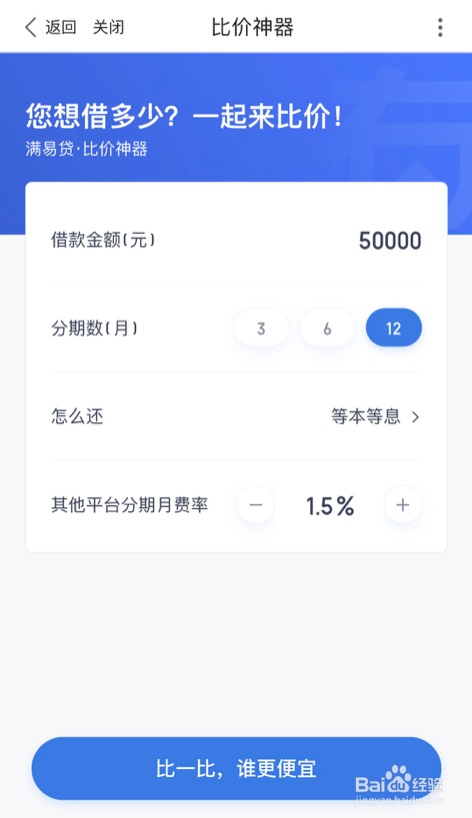 选择完对比的产品后,填写借款金额、分期数、以及手续费率,点击“比一比,谁更便宜”即可;