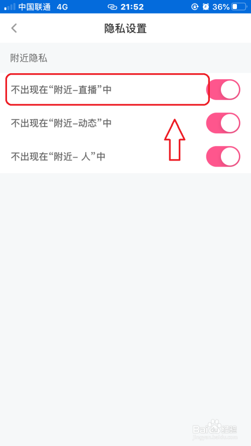第四步:将“不出现在附近直播中”后面的开关按钮打开,如下图所示。