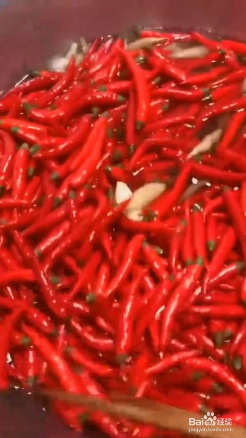 锅中加入水、花椒,八角,盐,米醋,煮开放凉。放入姜蒜片,冰糖,泡椒,泡椒水。倒入辣椒。搅拌均匀