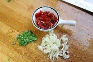 大蒜拍碎,切小,小葱切段,剁辣椒提前准备好,也可以换成新鲜的小米辣。