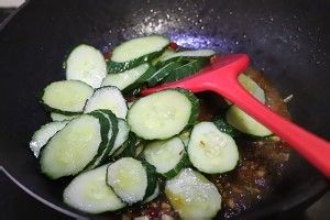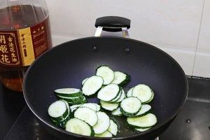 油锅烧热,先下入黄瓜片煎熟,煎的时候尽量把黄瓜摊开,让每片黄瓜都受热均匀。