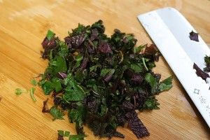 最后再把紫苏碎洒进来,紫苏不需要炒,翻裹均匀就可以出锅。