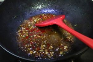 煎好的黄瓜先盛出来,锅中留底油,倒入蒜末,小葱,剁辣椒炒出香味。加入一勺料酒,少许生抽,蚝油,白砂糖,盐,调和均匀。