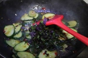 然后把煎好的黄瓜倒进来,翻炒均匀,黄瓜已经是熟的,不需要再过度翻炒。