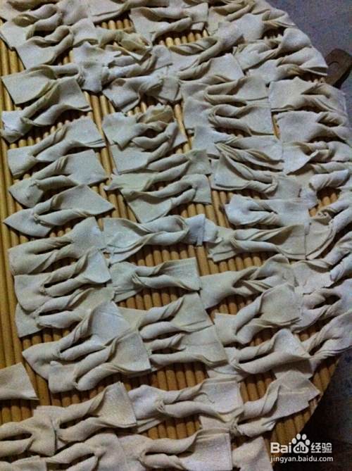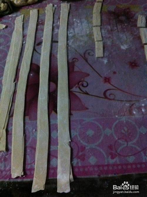 每三条叠落在一起,切成小长方形,中间划一个口子