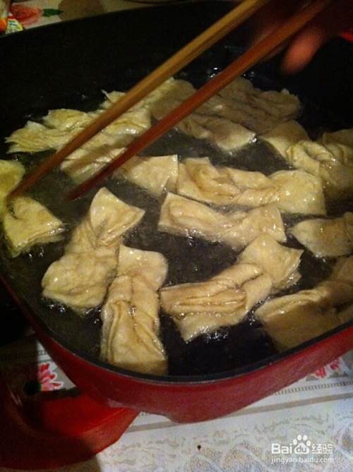 将做好的面食放在八成热的油温里炸,炸的时候翻个身,为了使两面都炸的均匀上色