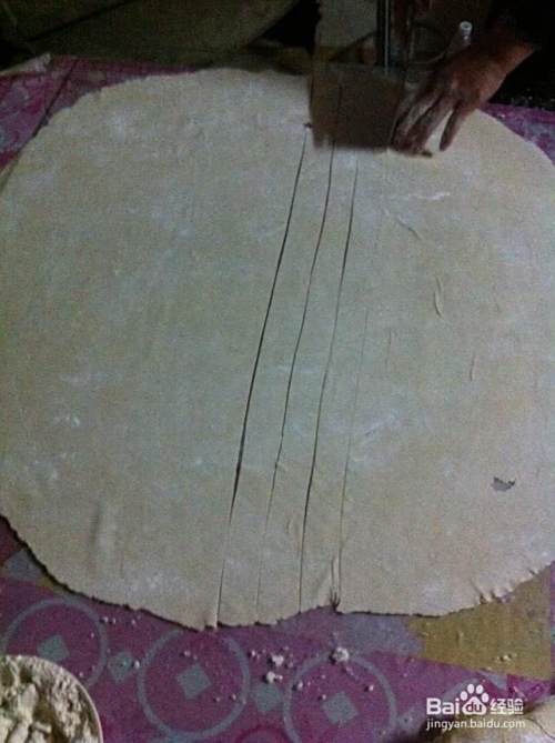 把面团按比例3:1(发酵面团:一般面团)揉在一起(妈妈说这样的比例是为了油炸的时候不会过分膨胀,炸出来的形状好看),然后像擀面条一样,擀成面皮,划成3cm宽的条状
