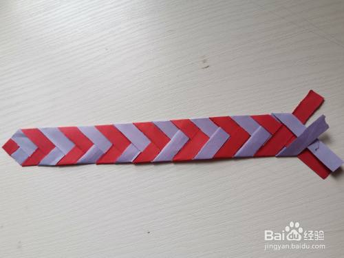 剪一张宽0.2CM左右的紫色长条,把编好的彩带在手上,在合适的位置贴上紫色卡纸纸环。然后戴在手上。
