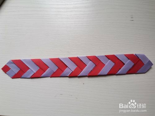 把左边红色的纸条往右边斜折,再把右边的红色纸条往左边斜折,重复按以上方法交叉折叠完。