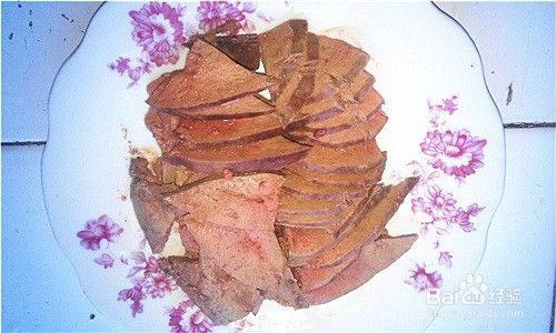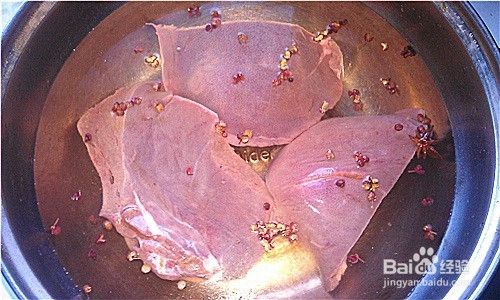 猪肝洗净、泡去血水,放入锅中加花椒、八角煮至8成熟,捞出、冷凉,切片备用