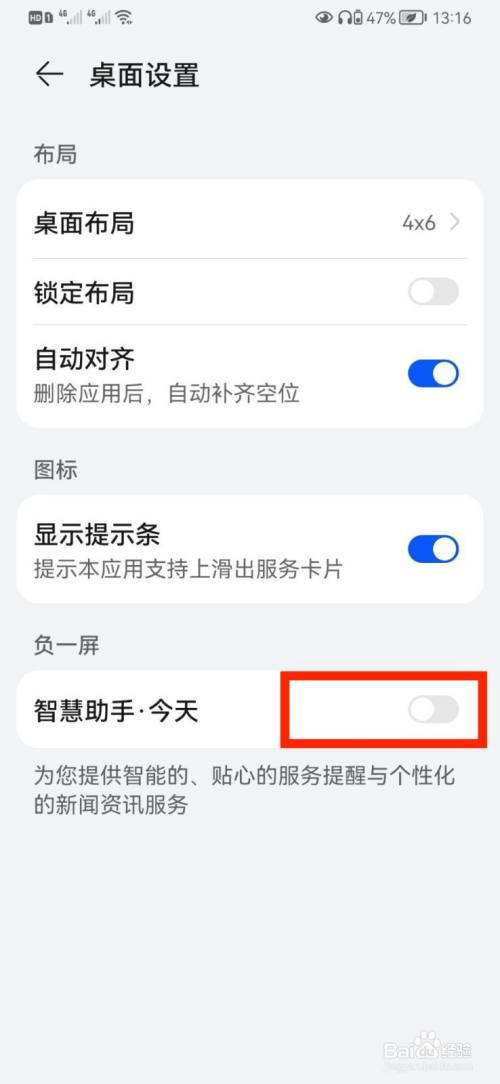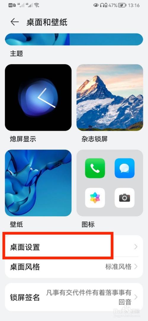 在华为手机上,通过手机的桌面和壁纸设置关闭桌面服务号屏幕的方法。
