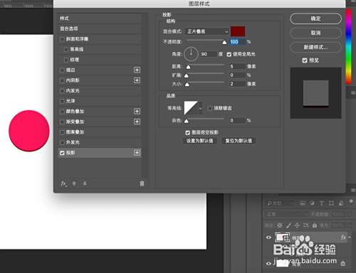 第二:直接双击正圆图层,进入图层样式,选择投影,更改投影参数不透明度,角度,颜色,距离,大小等。达到阴影的效果。
