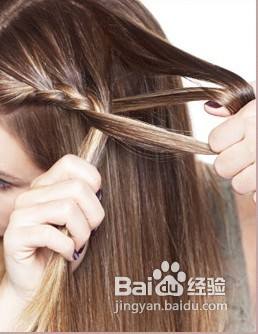 从剩余的头发里挑出一缕头发加入,就是法式麻花辫的编织方法。不过正常法式是在左右两只手依次加入新发束来编织,这款麻花辫只在上面部分加入新发束。