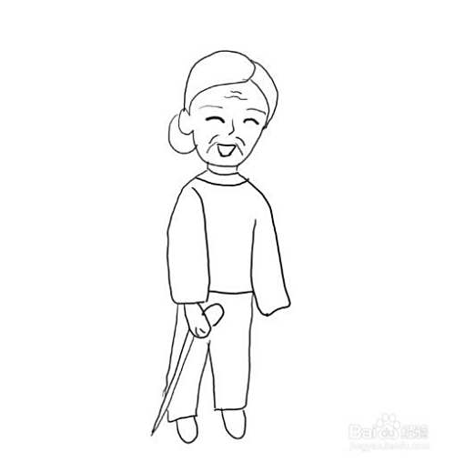 画出老奶奶的身体部分,记得手上拿着一根拐杖。