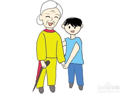 简笔画怎么画小孩子扶老人,画老人要注意画出脸上的皱纹和拐杖,头发白色不上色。