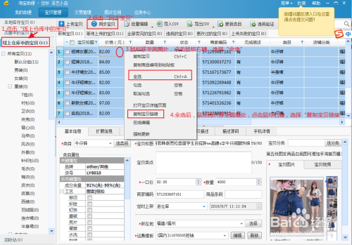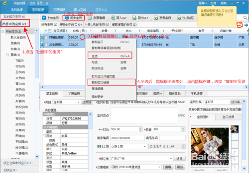 点击“线上仓库中的宝贝”,为了确保数据准确,点击“同步宝贝”,然后鼠标移至下图圆圈处,点击鼠标右键,选择“全选商品”,全选后,再次移至下图圆圈处,点击鼠标右键,选择“复制宝贝链接”。如下图: